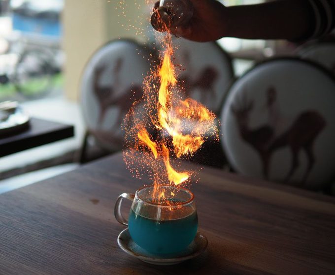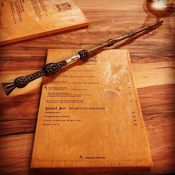Trong thực đơn của nhà hàng, có rất nhiều các món ăn lấy cảm hứng từ truyện như cocktail Goblet of Fire - món điểm tâm sáng của bác Hagrid dễ thương, đồ uống Elixir of Life không cồn lấy cảm hứng từ hòn đá phù thủy. Cocktail Goblet of Fire được pha chế từ rượu và siro Curacao xanh có khả năng phát sáng khi rắc thêm một chút “bột ma thuật”.