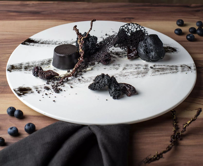 Món tráng miệng Black Magic là sự kết hợp giữa panna cotta mè đen, su kem đen cùng với kem xoài, bánh mì than giòn tan, chocolate đen, cùng với quả mâm xôi và kem ngọt.