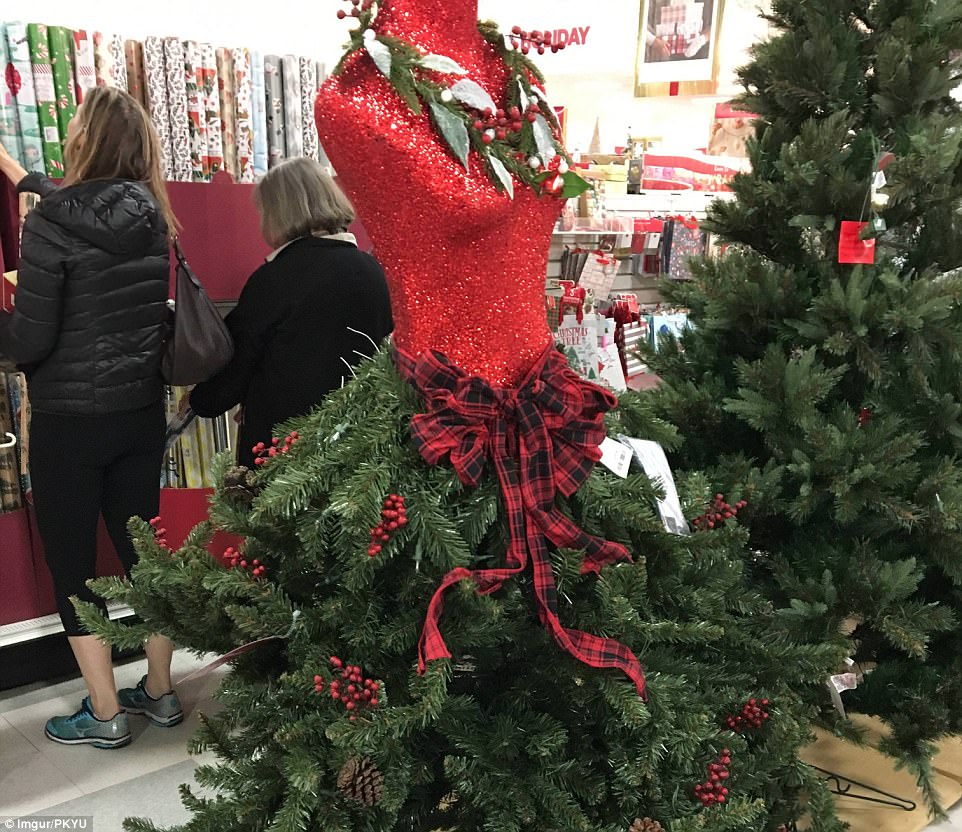 Một cửa hàng đã thử trang trí cây thông theo phong cách ma-nơ-canh, nhưng có vẻ không thành công lắm nhỉ?