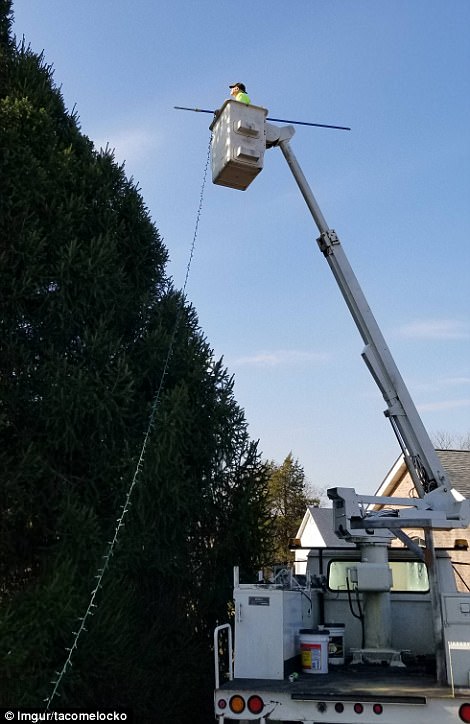 Một nhân viên trang trí đang lên đèn cho cây thông, có vẻ rất đáng để mong chờ đây…