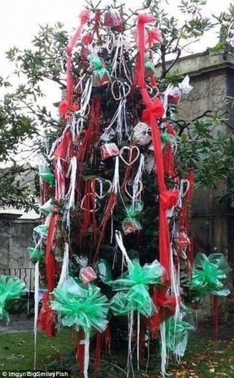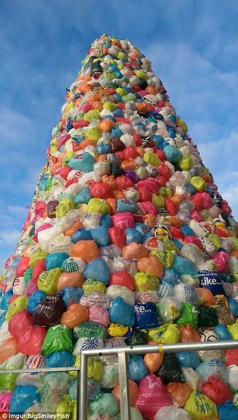 “Cây thông” được sáng tạo từ hàng tá túi nilong ở Mier, Stoke-On-Trent, Anh. Mặc dù ý tưởng rất độc đáo nhưng có vẻ cây thông này không mang không khí mùa Giáng sinh cho lắm.