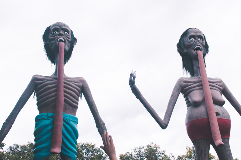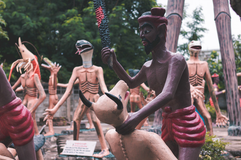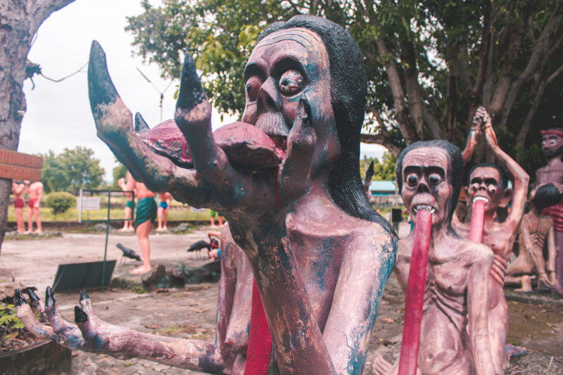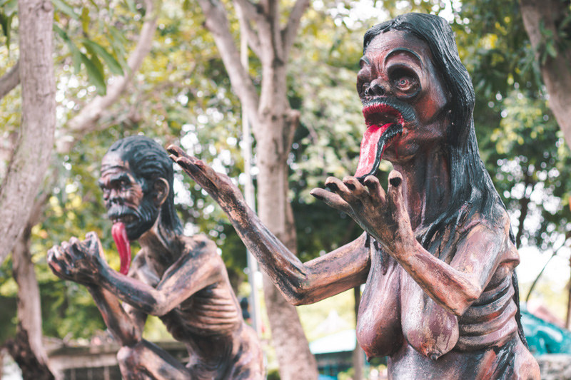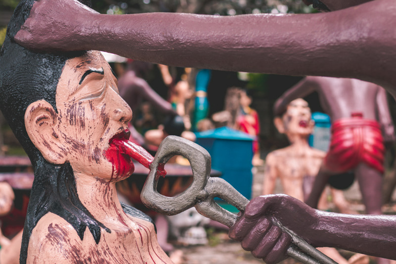 Có rất nhiều hình ảnh ớn lạnh của của những con ma đói quanh vườn được miêu tả như các hình ảnh dưới địa ngục. Hãy nhìn một con đường và bạn sẽ thấy bức tượng người đàn ông bị đâm xuyên qua nhãn cầu bằng một cây giáo. Ghé qua một khu khác, du khách sẽ gặp bức tượng một tù nhân bị xiềng xích. Bất kể nơi nào của khu vườn này mà du khách ghé qua, họ đều bắt gặp những hình bức tượng vô cùng đáng sợ.