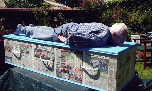 Một thành viên trong câu lạc bộ Kiwi nằm trên chiếc quan tài bọc giấy báo của chính ông.
