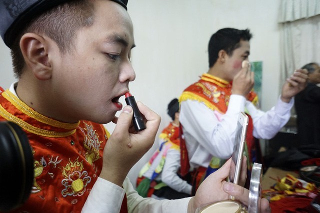 Dù đều là nam song để múa điệu “đĩ đánh bồng” họ đều được hóa trang giả nữ với son phấn, váy áo mớ ba mớ bảy… đội khăn xếp bên trong khăn mỏ quạ. Ảnh: Hữu Nghị