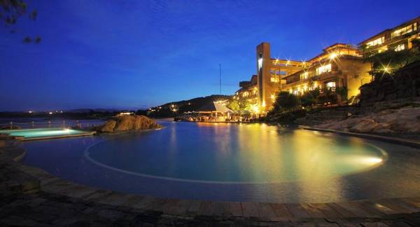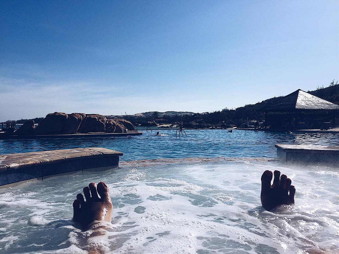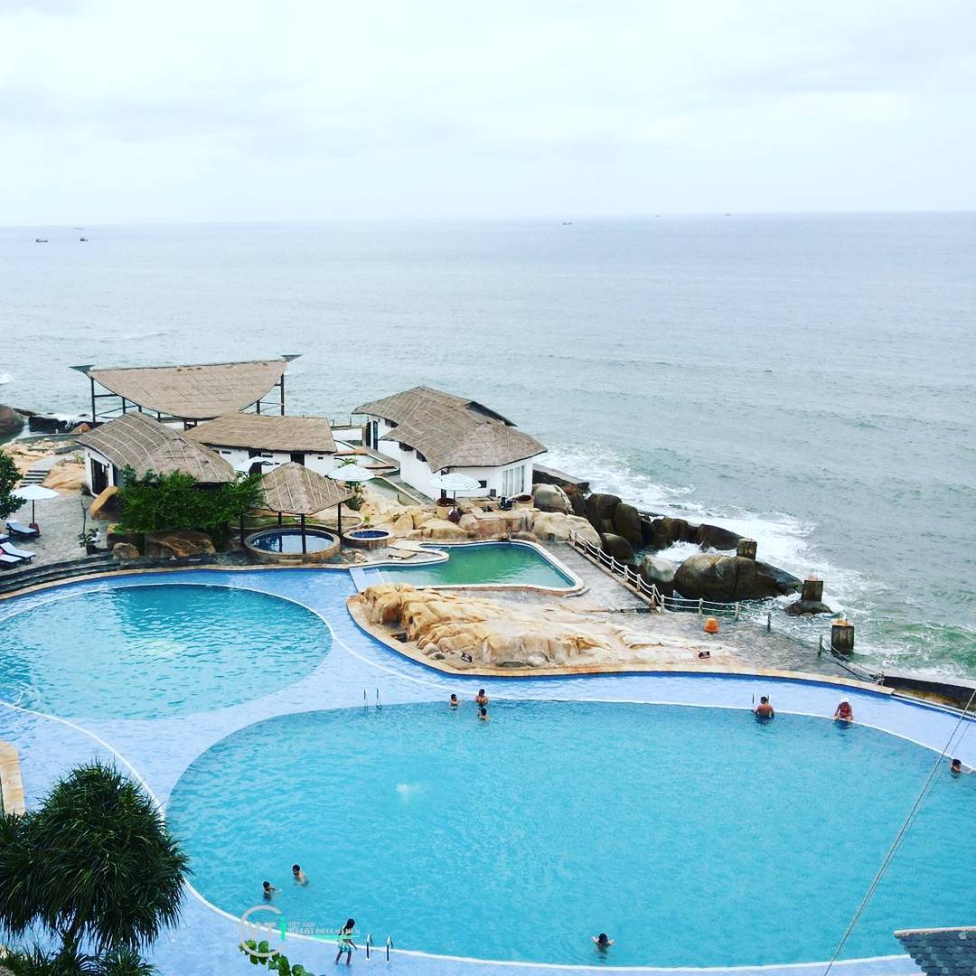 Một trong những điểm ấn tượng khi ghé thăm resort chính là hồ bơi lộ thiên nằm ngay sát vịnh biển. Cụm hồ bơi sát biển này được làm bằng vật liệu đá hoa cương lát sỏi tuyệt đẹp với nhiều hồ nước lớn nhỏ liền kề cùng nhiều phiến đá với đủ hình hài càng làm tăng thêm nét đẹp cho khu nghỉ dưỡng này.