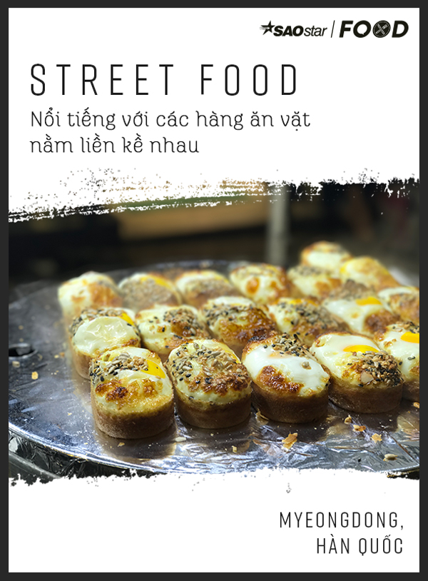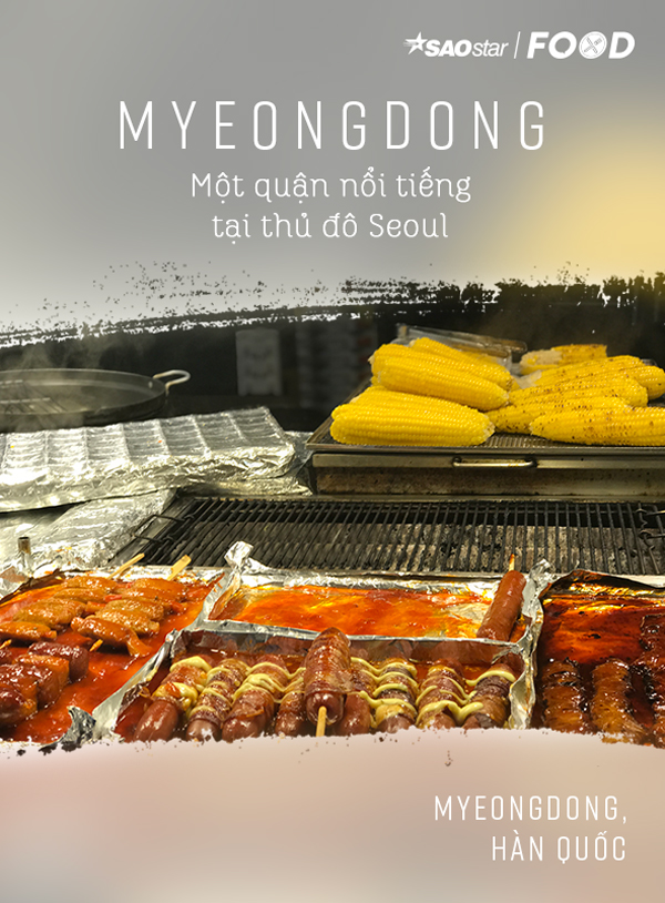 Nằm ở vị trí trung tâm, Myeongdong nhộn nhịp không chỉ với những cửa hàng thời trang, mỹ phẩm mà còn là thiên đường của các món ăn đường phố tiêu biểu cho ẩm thực của Hàn Quốc. Bạn sẽ choáng ngợp trước những gian hàng chào mời bằng vô số món ăn hấp dẫn và đặc trưng của người Hàn. Không dừng lại ở đó, các tiệm thức ăn, nhà hàng cũng san sát nhau với menu đa dạng cho bạn khoả lấp cơn đói sau một chuyến mua sắm dài.