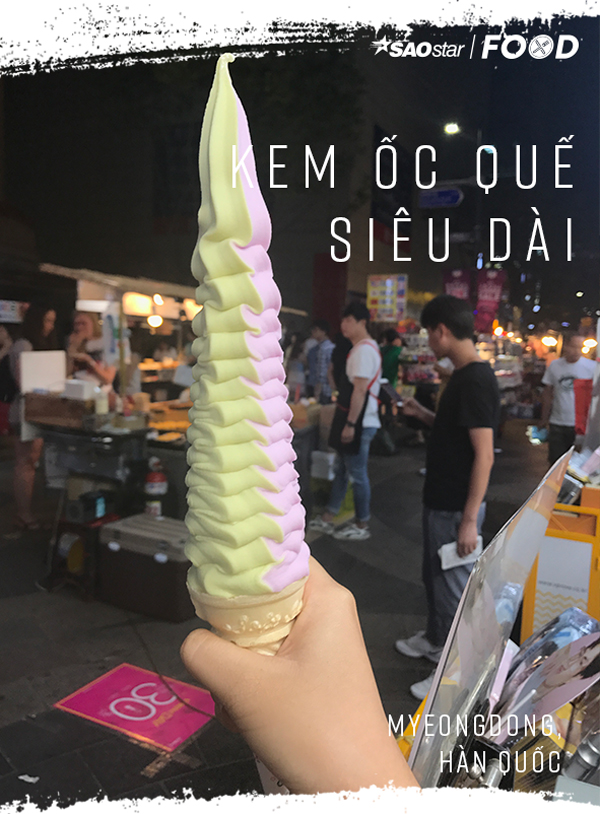 Hoà vào góp vui cho hương vị ở phố Myeongdong là sự có mặt của các loại kem. Một đặc sản chỉ Myeongdong có và nếu bạn chưa thử thì xem như chưa đến đây là que kem ốc quế dài ngất 32cm. Không ngọt gắt, béo ngậy như những que kem khác, kem ở đây vị dịu nhẹ thoang thoảng hương thơm của các mùi, tan dần làm mát cổ họng bạn.