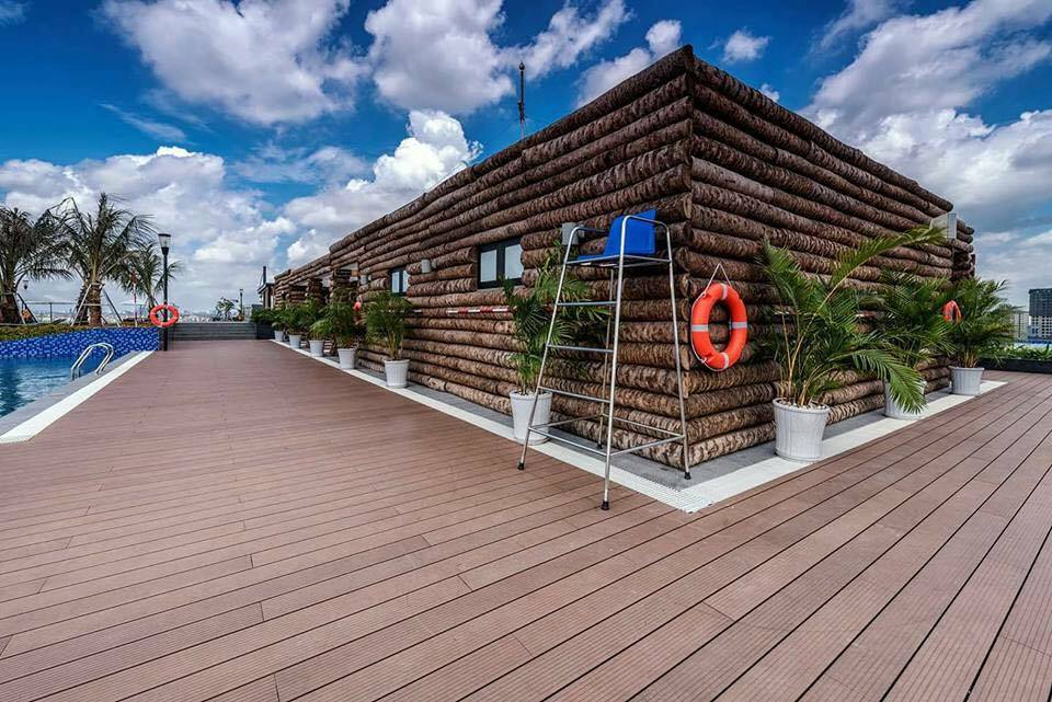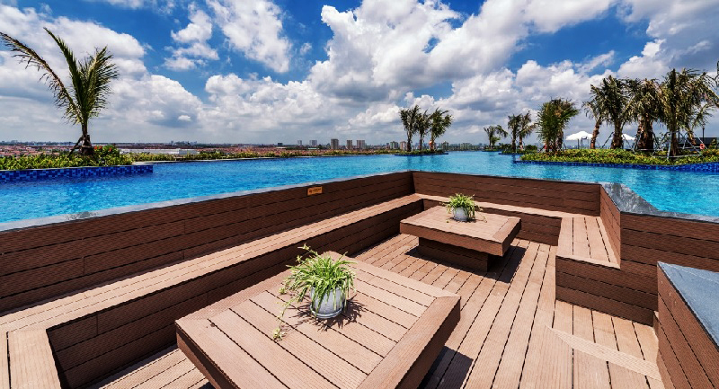 Khu bể bơi ở đây được thiết kế vô cùng sang chảnh với gạch ốp cao cấp tạo hiệu ứng nước biển xanh dương cùng lan can kính trong suốt bao quanh thành bể. Nước tràn trong xanh tạo nên hiệu ứng “không bờ” sẽ mang tới cho du khách khi đắm chìm trong làn nước sẽ có cảm giác mặt nước kéo dài đến tận “chân trời” trên tầng không, mênh mang, rộng lớn và tạo mọi góc view tuyệt vời nhất.