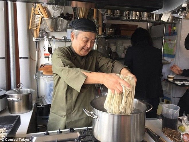 May mắn hơn nữa khi tôi có dịp học “vua đầu bếp” Akila Inouye cách nấu mì soba làm bằng bột kiều mạch tại Tsukiii Soba Academy (Học viện soba Tsukiii). Akila Inouye từng là đầu bếp riêng cho Steve Jobs và thầy của siêu đầu bếp Michelin.