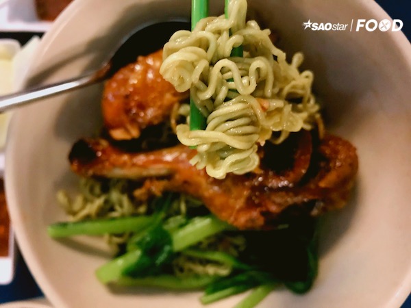Điểm nhấn hấp dẫn chính là chiếc đùi gà chiên giòn óng ánh, thấm vị và vô cùng vừa miệng. Bạn sẽ bị kích thích bởi lớp nước sốt sền sệt áo bên ngoài làm cho thòm thèm mà muốn thưởng trọn ngay tức khắc. Nếu bạn gọi mì khô thì phần gà sẽ được đặt trong tô mì để khi trộn lên thì sẽ hài hoà hương vị hơn. Còn với mì nước thì gà và mì sẽ để riêng ra nhé.