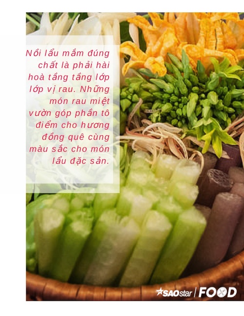Không cần đi đâu xa, với tay vớt vài cọng lục bình tươi xanh đang trôi lững lờ bên bờ sông, hay bông điên điển vàng rực đang độ vào mùa. Rồi không thể thiếu bông súng, bông bí, cù nèo, rau đắng, rau nhút, bắp chuối,… Một nồi lẩu tuy bình dị nhưng lại chan hoà đầy đủ tầng tầng lớp lớp màu sắc thật sống động. Các loại rau cùng các loại bông, nhúng vô mắm, để hơi tái, ăn dòn dòn, thấm đượm vị mắm mà không mất vị rau là cách ăn của dân sành điệu. Muốn đủ loại rau cho một lẩu mắm đúng chuẩn thì cũng là một bài toán khó cho người thợ nấu.