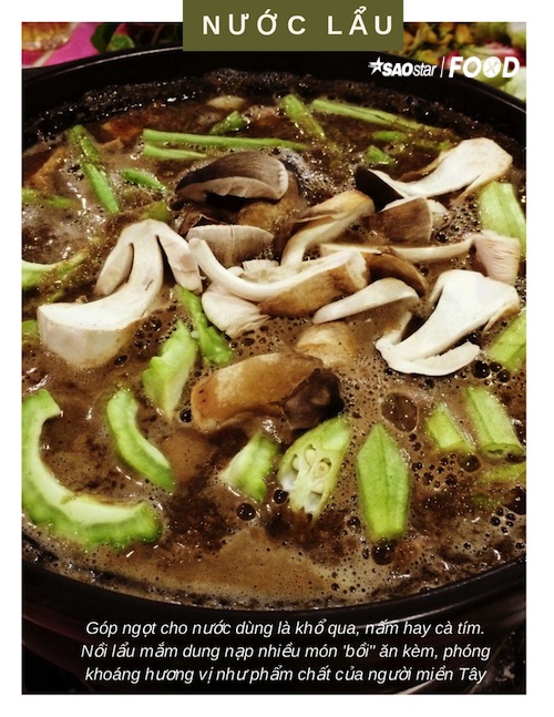 Lẩu mắm là cách ăn cầu kì, biến tấu ngoạn mục từ món mắm bình dị của người miền Tây. Nước dùng ngọt ngào được ninh từ xương heo hay vị thanh mát của dừa tươi là nền tảng của một phần lẩu ngon. Sau đó, mắm cá sẽ được pha loãng và cho vào hầm cùng phần nước súp với độ lửa thích hợp tạo nên bản hoà ca nhịp nhàng của vị mắm đặc trưng. Tuỳ vào người thợ mà có công thức nêm nếm sau cho hài hoà, nước dùng cần đậm đà vừa phải để không lấn át đi cái chất riêng của mắm. Người miền Tây hào phóng, lúc nào cũng “bồi” vào phần lẩu nào là cà tím, khổ qua, nấm,… để tăng thêm vị ngọt tự nhiên và sắc màu cho món ăn.
