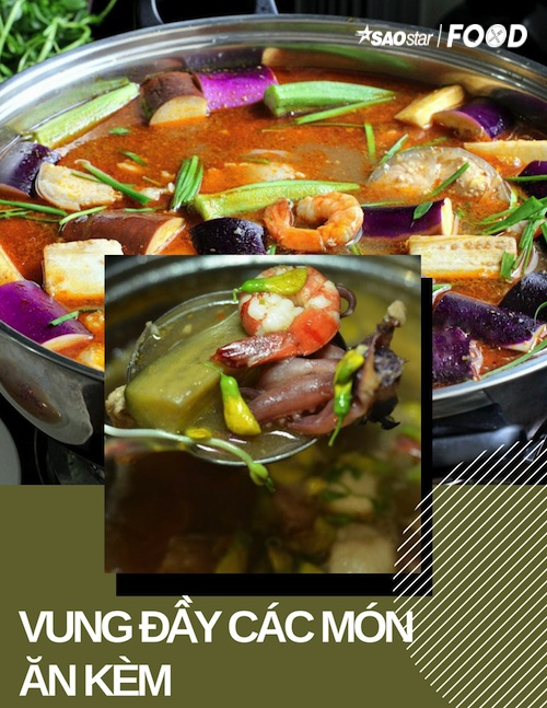 Một nồi mắm ngon là phải dung nạp đầy đủ các món ăn kèm. Không “kén cá chọn canh”, bạn có thể thoả thích kết hợp với vô số thực phẩm khác để bản nhạc dân ca ngân thêm nhiều nhịp điệu. Thịt ba rọi, cá basa, cá tra của vùng nước đậm phù sa hay những con tép, con tôm sần sật vị ngọt tự nhiên. Nói chung, nồi lẩu mắm hào phóng như chính người dân nơi đây, có thể làm hài lòng mọi khẩu vị.