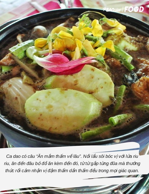 Lẩu mắm luôn là sự lựa chọn hàng đầu cho người dân miền Nam tiếp đãi thực khách phương xa. Không chỉ độc đáo ở mùi vị đặc trưng gây tò mò mà nồi lẩu mắm đầy vung và tô điểm những gam màu dung dị của miền sông nước đã là biểu tượng ẩm thực nơi đây. Để rồi những người con xa quê lại phải vấn vương hương vị, nhớ mãi nồi lẩu đậm đà.