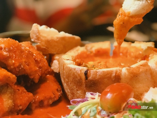 Mỗi chảo gà sẽ luôn được kèm theo một chiếc bánh mì làm thủ công tròn to ụ. Mở phần nắp bánh ra, thực khách phải ngất ngây khi lớp phô mai hoà quyện cùng cà ri tan chảy thơm phức đang chực chờ. Cái giòn của gà nay được tiếp thêm cái béo cái sệt của phần nước sốt thì chẳng thể chê vào đâu.