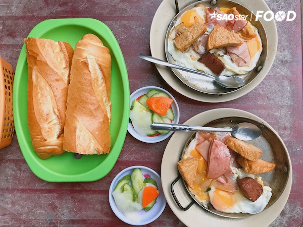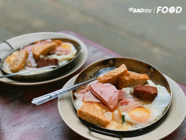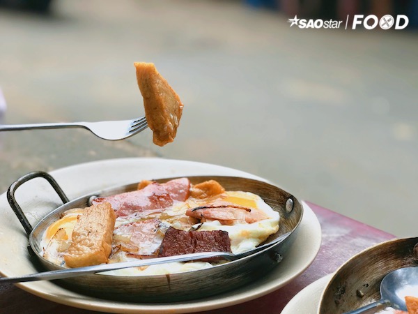 Bạn nên gọi một phần thập cẩm để có thể hài hoà và kết hợp từng tầng vị giác. Chiếc chảo thiếc nóng hổi đầy ắp cùng trứng ốp la, chả cá, chả lụa, jambon và pate gan trông vô cùng hấp dẫn. Đừng quên dặn trứng đừng chín quá nhé, như thế mới có thể cảm nhận được vị béo thơm của món ăn.