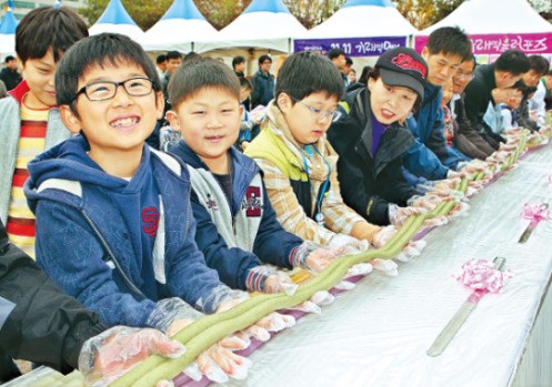Các em học sinh cùng nhau làm bánh gạo sợi dài với hy vọng một cuộc sống dài lâu và hạnh phúc.