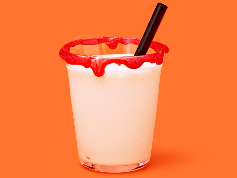 - Phần sữa lắc: Cho một ly kem vani và ¼ ly sữa tươi vào máy xay xay đều rồi đổ ra ly gel đã trang trí là hoàn tất.