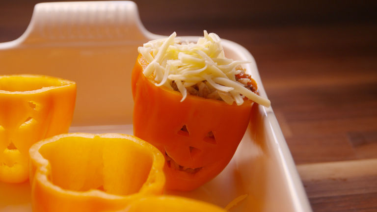 Cắt và giữ lại phần đầu của ớt chuông. Bỏ hạt và phần ruột của ớt chuông. Cho cả quả ớt và đầu ớt vào nồi chần sơ khoảng 2-3 phút, sau đó vớt ra và ngâm vào nước đá. Khi ớt đã nguội, vớt chúng ra và tiến hành khắc những khuôn mặt ma quái lên mặt quả ớt.
