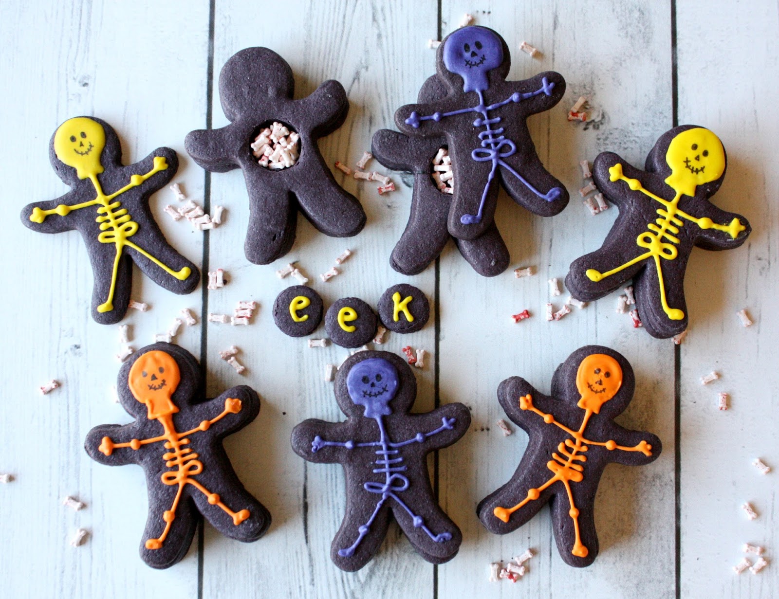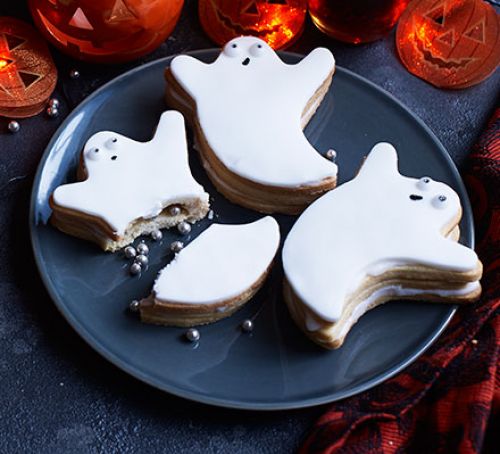 - Bước 1: làm nóng lò đến 2000C, lót sẵn giấy nến dưới khay bánh.Bước 2: Cho bơ vào tô, đánh bơ bằng máy đánh trứng cho đến khi thật mềm mịn. Sau đó cho đường, trứng, vani và bột vào đánh cùng để tạo vỏ bánh. Nếu thấy hỗn hợp còn hơi dính, thêm bột vào và trộn đều. Sau đó bọc bột lại bằng màng bọc thực phẩm và cho bột vào tủ lạnh trong nửa giờ.Bước 3: Đổ bột ra mặt bàn đã được phủ một lớp bột áo, sau đó chia bột bánh làm hai phần. Cán mỏng một phần, dày khoảng 5 mm. Sử dụng khuôn hình con ma (hay bất kì loại khuôn hình thù ma quái nào mà bạn thích) ấn và cắt ra 12 miếng. Mỗi chiếc bánh sẽ được tạo thành từ 3 miếng bột này. Cho bánh vào khay nướng đã được lót giấy nến, cất lại vào tủ lạnh. Làm tương tự với số bột còn lại. Khi cho phần bột thứ 2 vào tủ lạnh thì lấy phần bột đầu tiên ra.