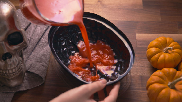 4. Đổ hỗn hợp vào khuôn. Để nguội ở nhiệt độ phòng rồi cho vào tủ lạnh cho thạch đông lại.
