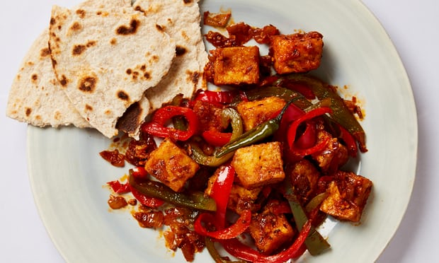 Cho thì là và hành tây vào chảo, xào từ 10 đến 12 phút, chờ cho đến khi hành tây mềm và ngọt. Thêm tỏi, gừng, và ớt chuông đã cắt nhỏ và chờ thêm 5 phút; sau đó thêm tiêu xay, nước xốt cà chua, nước tương, đường và muối.