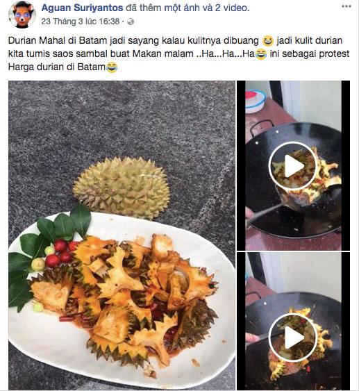 Để phản đối việc giá cả trái cây mà đặc biệt là quả sầu riêng ở địa phương này quá đắt, chàng trai đã quyết định quay clip xào sầu riêng rồi đăng trên facebook cá nhân có tên Aguan Suriyantos ngày 23/3 vừa qua.