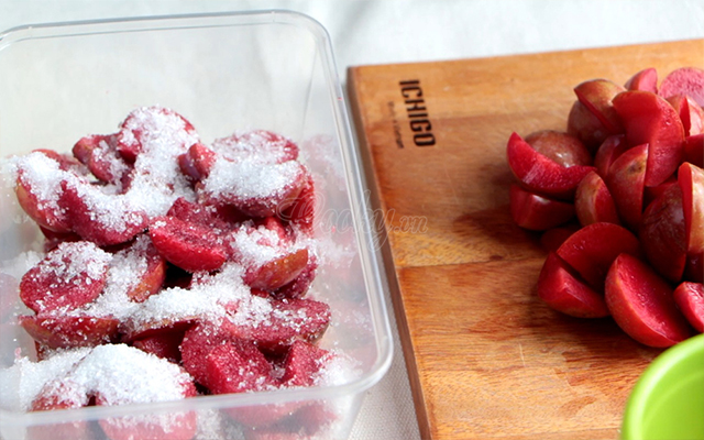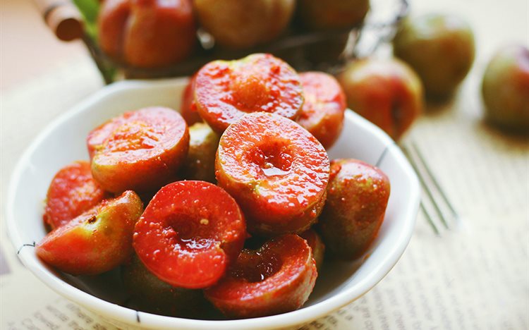 Một món ăn khá được lòng chị em đó chính là mận dầm chua ngọt. Món ăn này không quá khó để chế biến, chỉ cần cắt đôi quả mận thành 2 phần. Tiếp theo cho mận đã cắt vào âu rắc đường rồi trộn đều. Khi đường thì cho muối vào xóc đều. Cuối cùng thêm ớt bột, xóc lại một lần nữa cho đều.