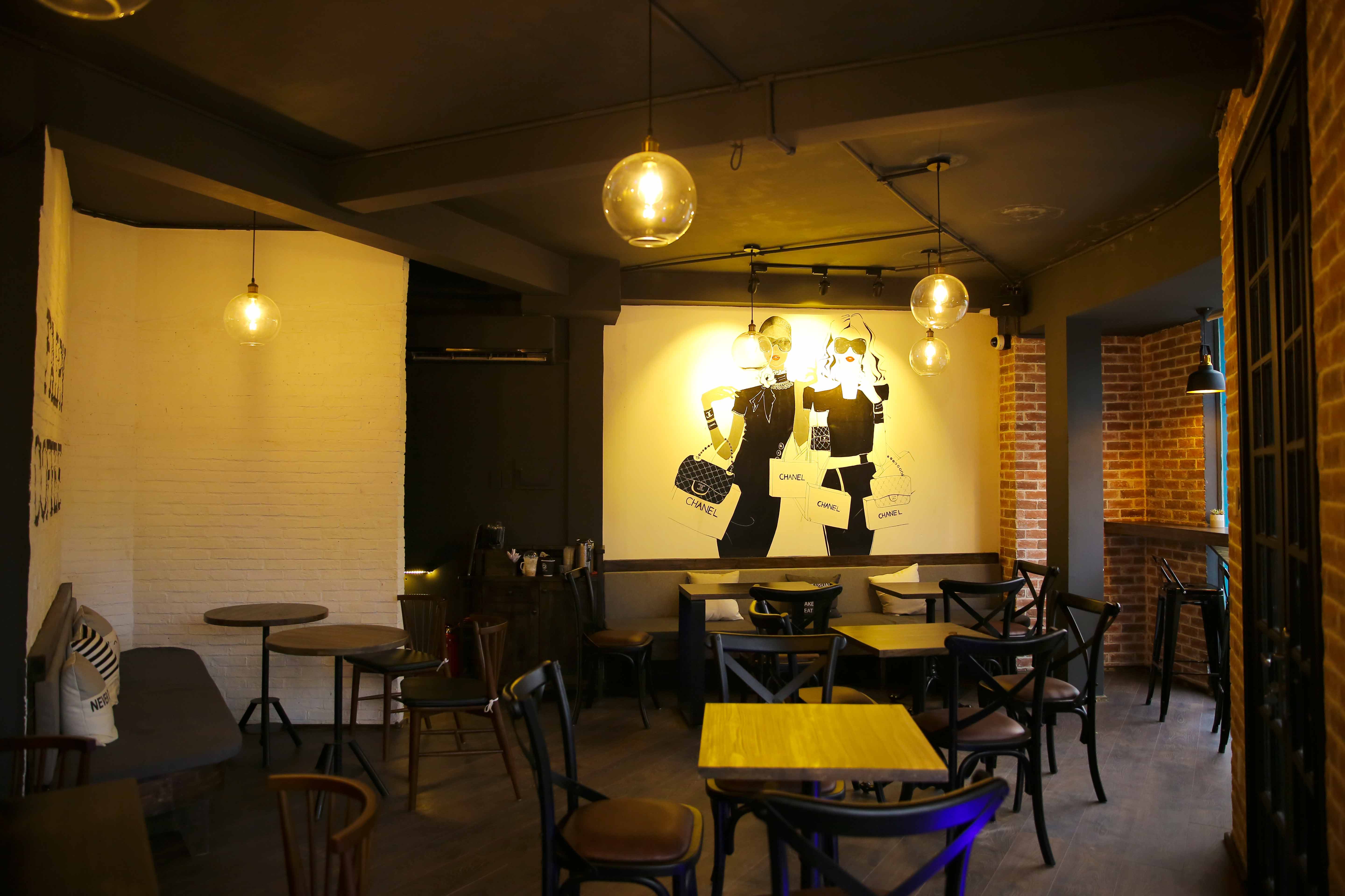 Không gian quán thanh bình với ánh sáng ấm áp, âm nhạc nhẹ nhàng. Những bức họa đẹp trên tường, vật dụng trang trí nhỏ xinh.