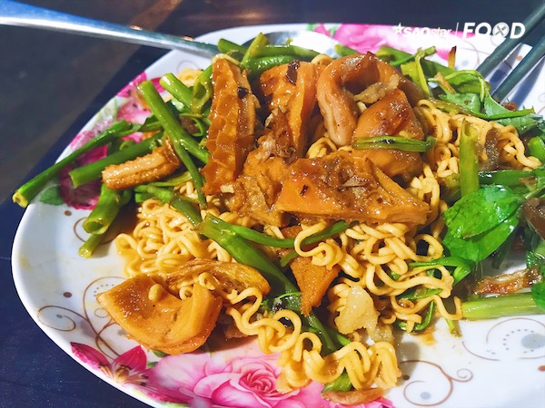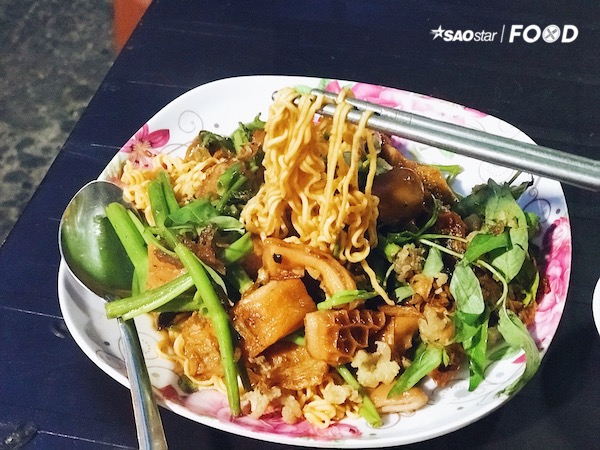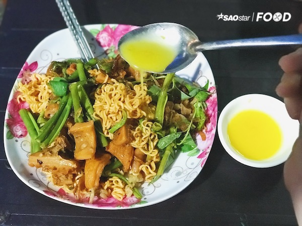 Mì ăn kèm phải là mì gói mới đúng vị, bởi chúng có độ khô và dai nên khi xào cùng thức ăn sẽ hoà hợp ăn ý với gia vị. Trộn đều phần mì phía dưới, thức ăn sẽ thấm đều cùng nước sốt. Sợi mì mang đến cái giòn dai khi chín luộc vừa chín tới. Các món lòng bò được xử lí kĩ nên bạn sẽ không thấy mùi tanh vốn có mà thay vào đó là hương thơm đậm đà của nguyên liệu nấu cùng. Lòng bò, lá tía, phèo,… mềm ngọt hoà quyện cùng vị chua nhẹ kích thích vị giác của thực khách.