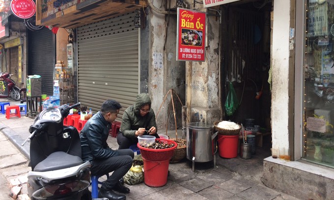 Gánh bún ốc này vốn nổi tiếng càng được biết đến nhiều hơn sau khi xuất hiện trên kênh CNN khi được đầu bếp Anthony đến thử. Hàng vừa bán bún ốc chan nóng và bún ốc nguội, giá 40.000 đồng/bát. Bát bún ốc gây ấn tượng vì đựng trong bát đẹp, ốc to, sạch. Quán bán chủ yếu buổi sáng, đến 15h là nghỉ. Đây là một trong số ít hàng ăn nổi tiếng ở phố cổ mở xuyên Tết. Ảnh: Vy An.