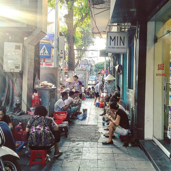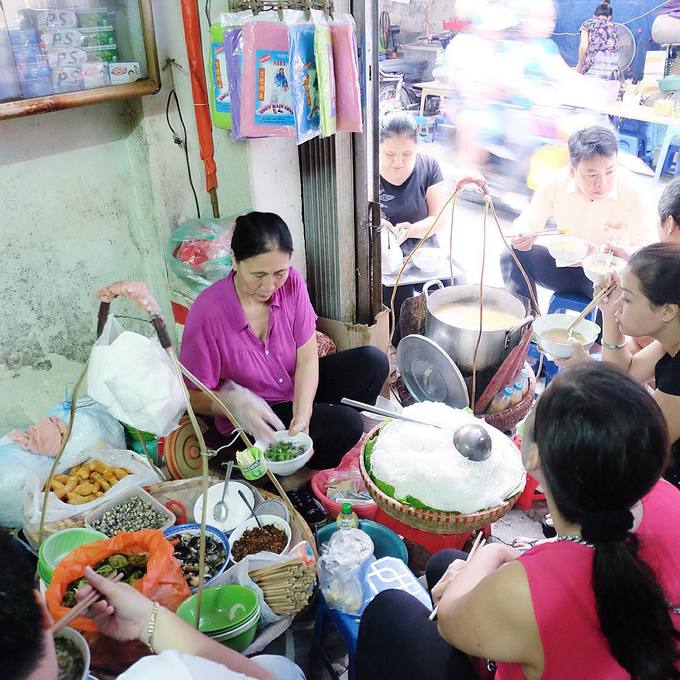Hàng bún ốc mở lại từ sáng mùng 3 Tết. Qua khoảng 25 năm, hàng bún ốc cô Thêm gây ấn tượng với thực khách phố cổ bởi quầy bán chính là đôi quang gánh. Tô bún ốc không cầu kỳ với bún, ốc và nước dùng chua thanh. Khách có thể gọi thêm thịt bò, giá 40.000 đồng/bát. Tuy nhiên, quán cũng mất điểm vì không gian chật, hẹp. Ảnh: Dingolong.
