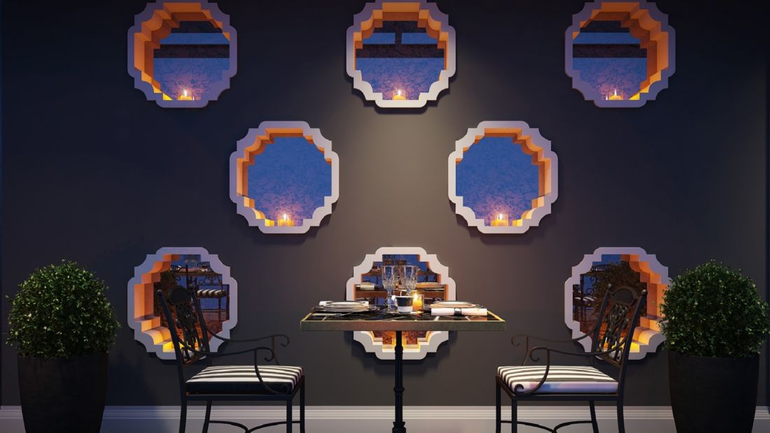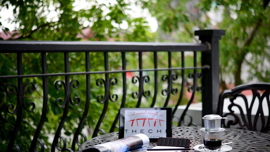 Sân thượng ngoài trời của khách sạn phục vụ như một khu ăn uống chung, mang lại cảm giác “đông - tây hội ngộ”, với những chiếc bàn gỗ chạm trổ với hoa văn mang đặc trưng của phương Đông.