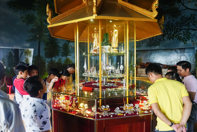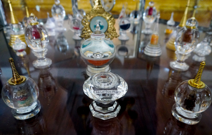 Những viên xá lợi trong veo được trưng bày cẩn thận trong tủ kính. Bảo tháp chỉ mở cửa đón khách ngày hai buổi. Sáng từ 8h đến 10h, chiều từ 14h đến 16h.