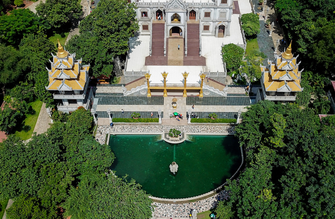 Ngay dưới chân bảo tháp là hồ bán nguyệt có diện tích 280 m2, ở giữa có vòi phun nước hình rồng.