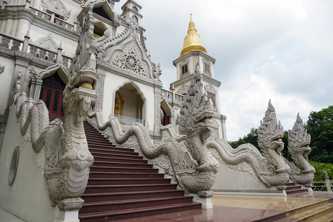 Cạnh hồ nước là lối lên bảo tháp, du khách phải bỏ dép ở dưới sân nếu muốn lên các tầng lầu. Xung quanh lối lên là linh vật rồng ngậm ngọc uốn lượn cùng mây. Kiến trúc của chùa mang nét Phật Giáo Nam Tông đặc trưng trong vùng Đông Nam Á, với các họa tiết trang trí như rồng uốn lượn tạo thành mái vòm, hoa văn nổi, phù điêu, bánh xe chuyển pháp luân,…