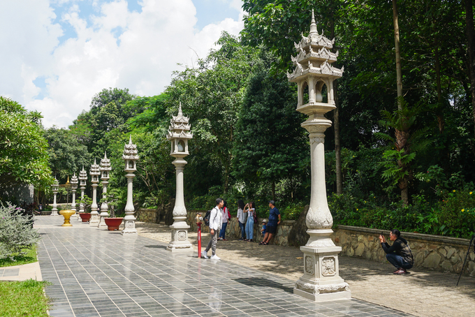 Khuôn viên chùa có diện tích lớn bậc nhất trong các ngôi chùa ở Sài Gòn và bao phủ nhiều cây xanh. Quanh sân chính là hàng thạch đăng tự rất đặc trưng của kiến trúc Phù Nam cổ xưa.