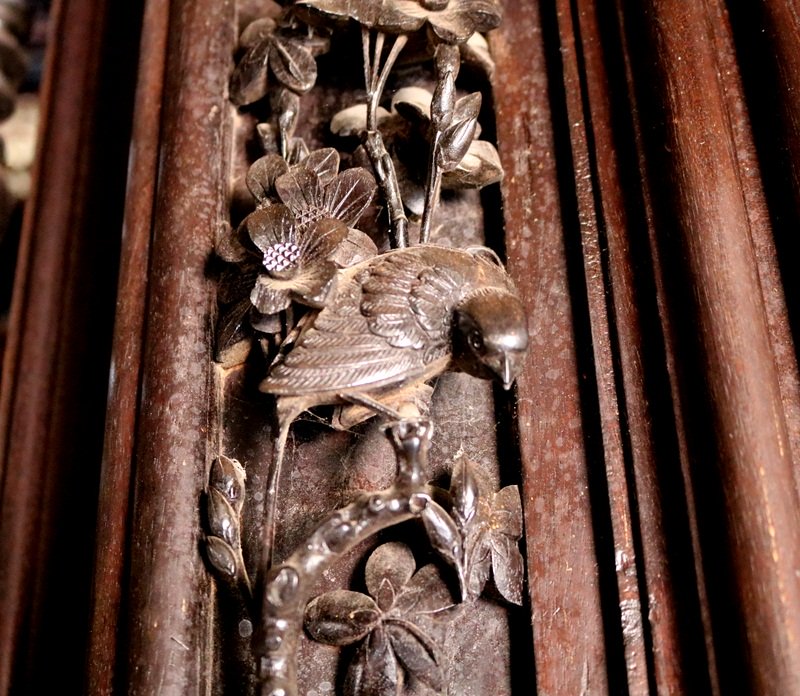 Hình ảnh chim đậu trên cành hoa được chạm khắc công phu.