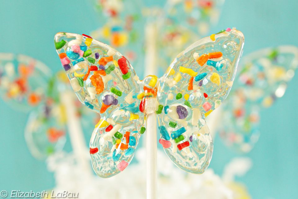 Kẹo mút hình con bướm cũng có công thức chế biến chẳng khác gì những chiếc kẹo mút nhiều màu. Tuy nhiên, điểm đặc biệt của chiếc kẹo này là nó được đúc khuôn hình con bướm sặc sỡ màu sắc với điểm nhấn là những hạt cốm màu xanh, đỏ, tím, vàng,… trông thật bắt mắt.