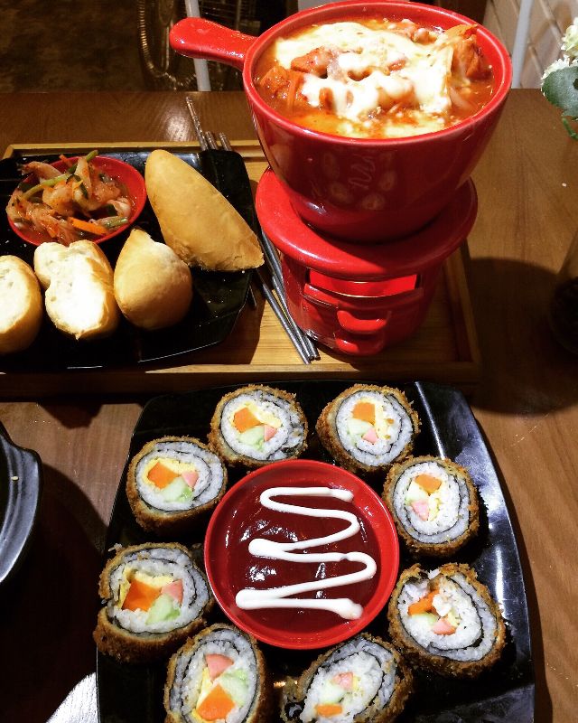 Cơm cuộn - tokbokki phô mai ở Tạ Quang Bửu.