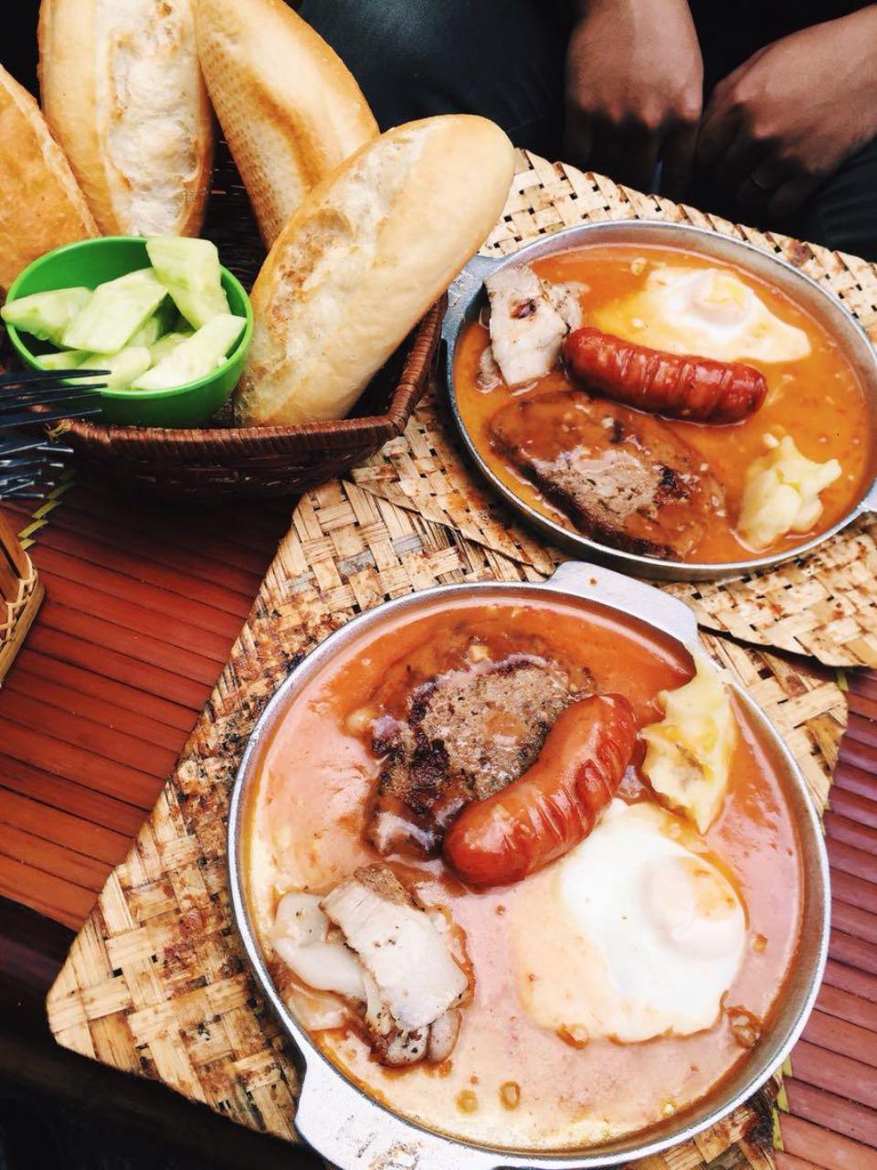 Một trong những món ăn kể đến đang “nức tiếng” ở đây là bánh mì chảo, tào phớ, thịt xiên…