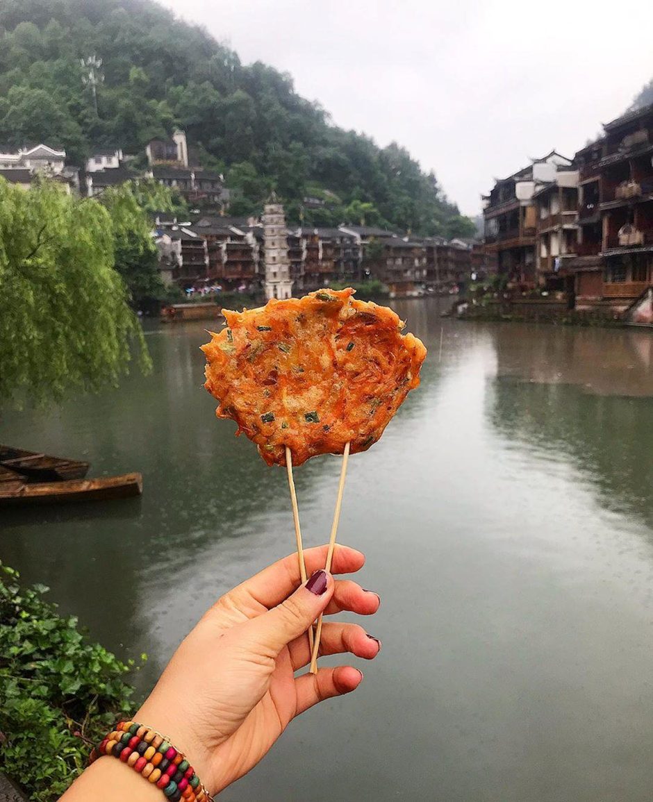 Đã đến Phượng Hoàng Cổ Trấn thì nhất định không thể bỏ qua được món bánh tép nhảy đặc sắc này. Bánh được làm từ những con tép tươi ngào với bột chiên rồi chiên lên giòn rụm rất thơm ngon và lạ miệng.