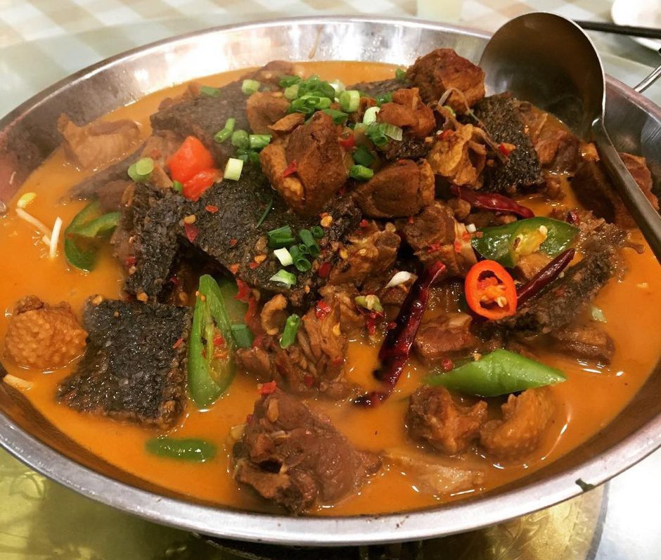 Vịt hầm tiết món ăn độc đáo của vùng Tương Tây và rất nổi tiếng ở Phượng Hoàng Cổ Trấn. Trong tiết trời se lạnh, bạn sẽ cảm thấy ấm bụng ngay lập tức khi sì sụp bát súp vịt hầm thơm phức này. Đây cũng là món ăn được rất nhiều thực khách yêu thích khi đến với cổ trấn này.