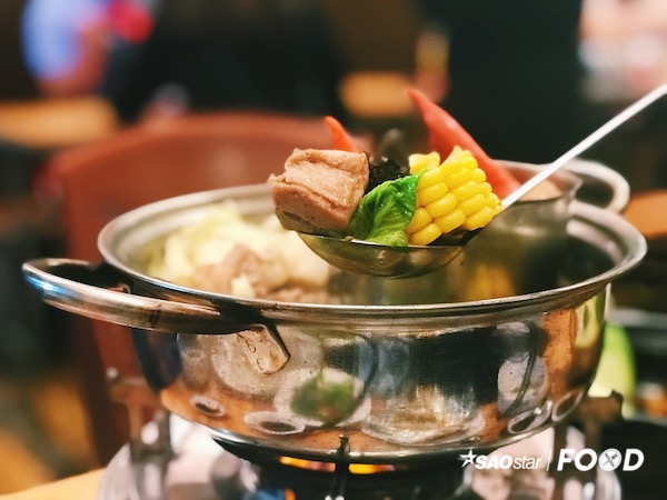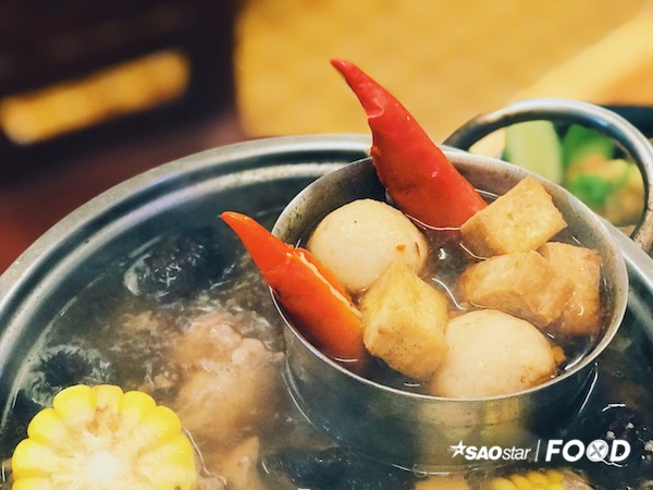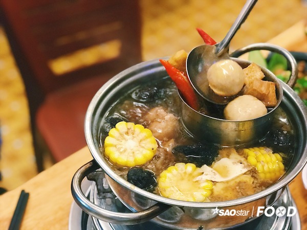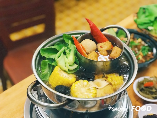 Nước dùng được ninh từ củ cải trắng, bắp và các loại nấm nhĩ, táo tàu đặc trưng của ẩm thực người Hoa. Vị ngon ngọt tự nhiên của nước súp nóng hổi hoà cùng các thức ăn kèm khiến nồi lẩu vô cùng hấp dẫn. Nếu như bên nước dùng cay là sự góp mặt của các loại chả, tàu hủ,… trong cái cay cay của sa tế thì bên nước dùng thường lại đầy ắp nào thịt gà, tàu hủ trắng, nấm đông cô. Mỗi bên là một khẩu vị sẽ giúp làm bữa ăn mới mẻ và phong phú hơn.