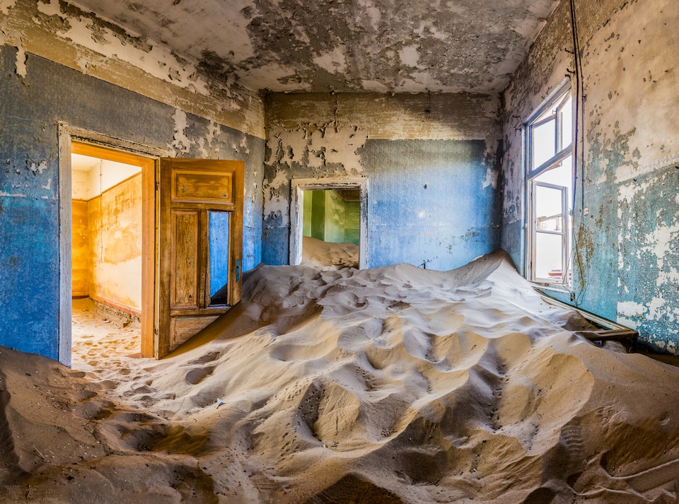 Còn đây là ngôi làng bị bỏ hoang ở Kolmanskop. Nơi này đã từng phát triển thịnh vượng sau khi một công nhân đào được kim cương vào năm 1908. Đã có nhiều công trình hiện đại được xây dựng như bệnh viện, nhà ga, casino… nhờ vào nguồn khai thác kim cương.