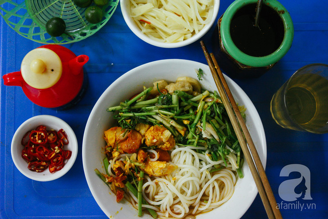 Rời xa vỉa hè chật hẹp, bạn dường như lạc vào một quán ăn gia đình và được thưởng thức món bún cá được bê ra ngay từ bếp đang bốc khói nghi ngút khiến bữa ăn mang đậm hương vị ấm cúng. Sợi bún ở đây là loại sợi to kết hợp với cá quả rim vàng cùng những miếng tóp mỡ béo ngậy mang tới cho thực khách một cảm giác thực sự khác biệt.