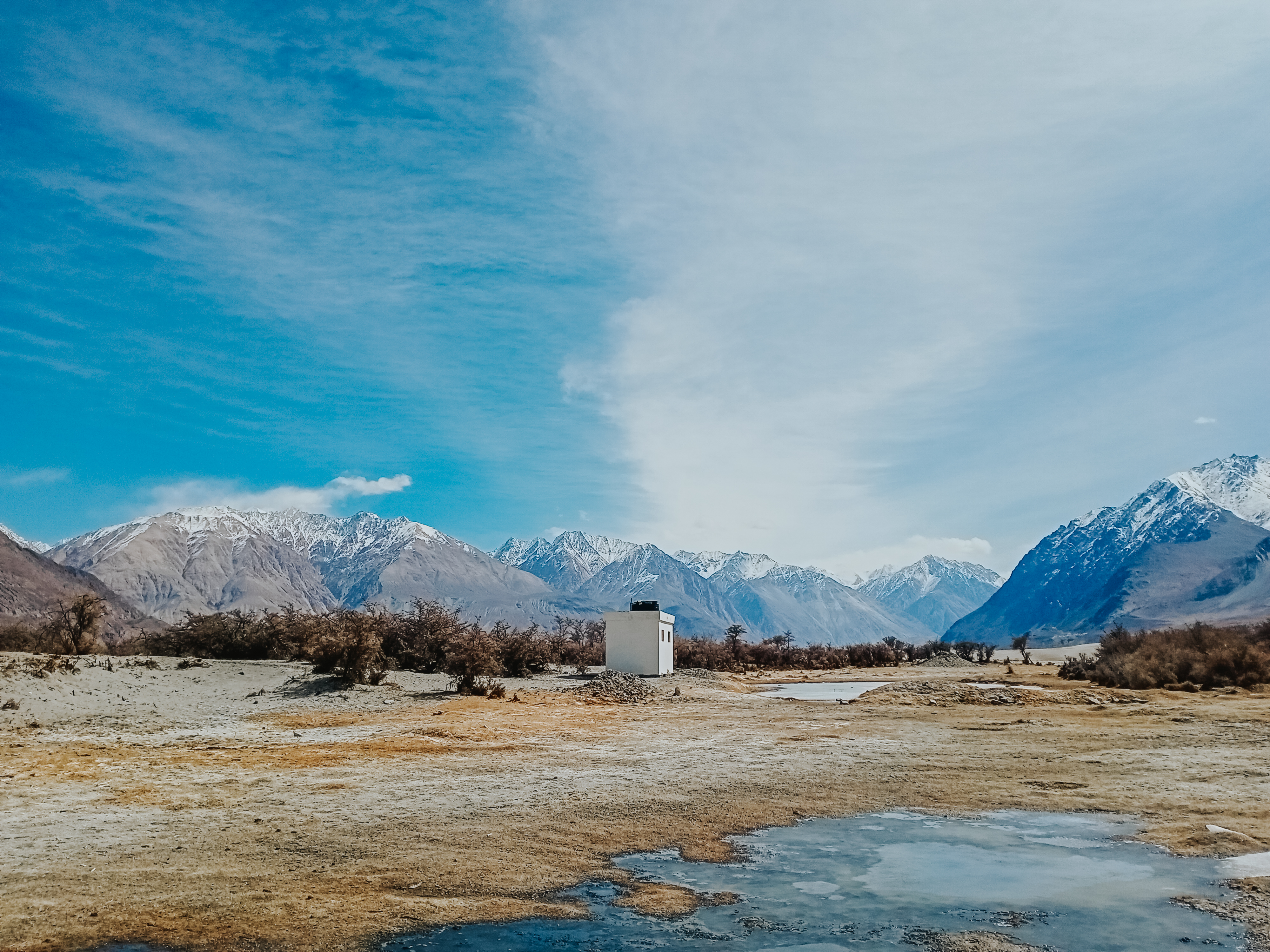 Đã đến Ladakh nếu không đặt chân đến thung lũng Nubra là một hối tiếc nhất trong chuyến đi. Một vùng đất đa sắc với màu trắng xóa của tuyết, màu trắng ngà của những cồn cát “nóng bỏng”, màu xanh trong kì diệu của bầu trời, và một ít màu xanh mãnh liệt của những tán cây mọc lên giữa sa mạc lạnh lẽo… bao nhiêu thứ ấy chắc chắn sẽ khiến bạn bị mê hoặc ngay từ cái nhìn đầu tiên.