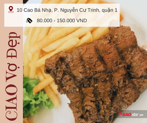 Một địa chỉ nữa bạn nên lưu về ngay để mỗi khi muốn thưởng thức những hương vị món Âu thì tham khảo là Ciao Vợ Đẹp. Đây là cái tên lúc nào cũng được xuất hiện trong danh sách “những quán ăn Tây nhưng giá hạt dẻ”. Món ăn ngon miệng, hương vị đa dạng, giá cả phải chăng,… đây là những điều đã giúp thực khách hay tìm đến quán cho một bữa tối lãng mạn cùng người yêu.