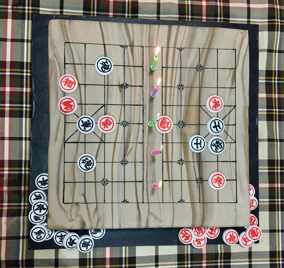 Sau khi thổi nến, chiếc bánh được cắt, ăn xong bố chị đã giữ lại những quân cờ làm kỉ niệm.