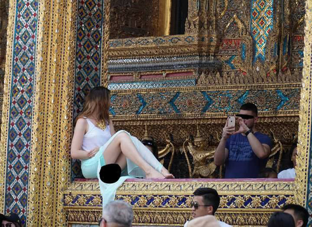 Hình ảnh về một nữ du khách ngoại quốc mặc đồ mỏng manh, tạo dáng phản cảm tại chùa Wat Phra Kaew nổi tiếng ở Bangkok khiến truyền thông và người dân Thái Lan hết sức phẫn nộ.